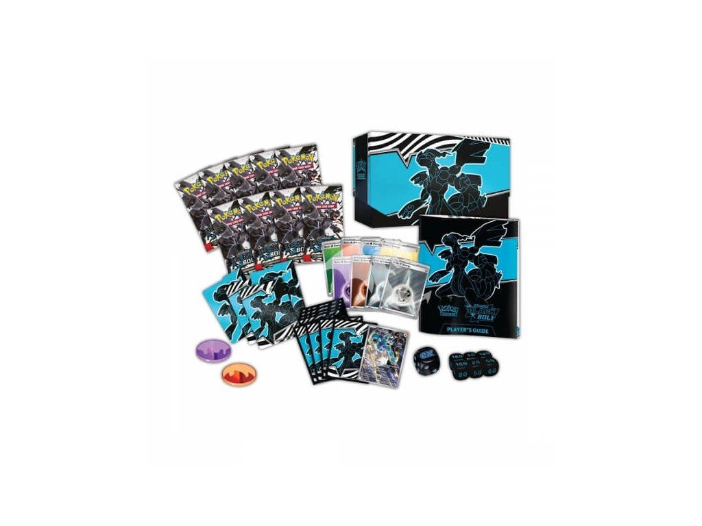 Elite Trainer Box Black Bolt je balení 9 booster balíčků Pokémon karet, 1 promo karty, 65 obalů, 6 kostek a oddělovačů. Každý Pokémon balíček obsahuje 10 karet. Celkově tak získáte 90 Pokémon karet (a jednu promo kartu).