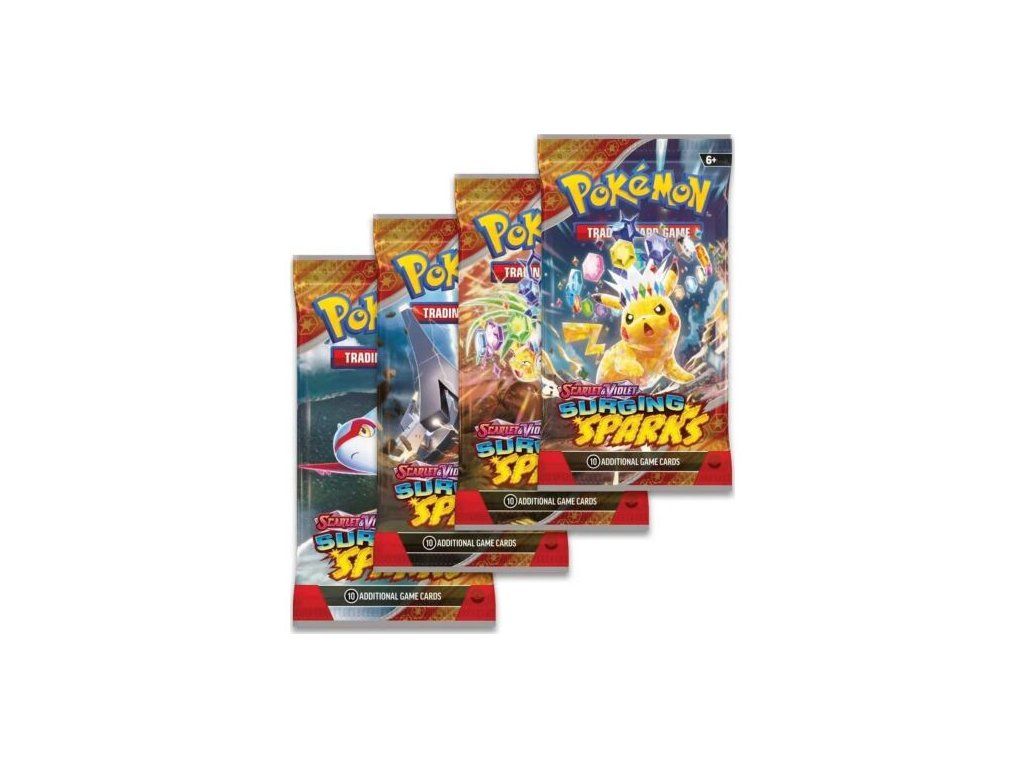 Balíčky Pokémon karet jsou ideálním malým dárečkem pro každého sběratele, či hráče. Jedná se o nejmenší jednotku, jak nakoupit Pokémon karty. Balíčky Surging Sparks mohou mít čtyři různé verze (arty), obsah je však vždy stejný (tj. náhodně namíchaný).