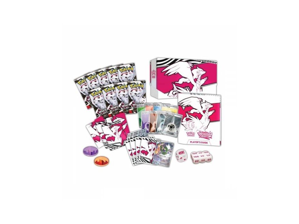 Elite Trainer Box White Flare je balení 9 booster balíčků Pokémon karet, 1 promo karty, 65 obalů, 6 kostek a oddělovačů. Každý balíček obsahuje 10 karet. Celkově tak získáte 90 Pokémon karet.